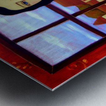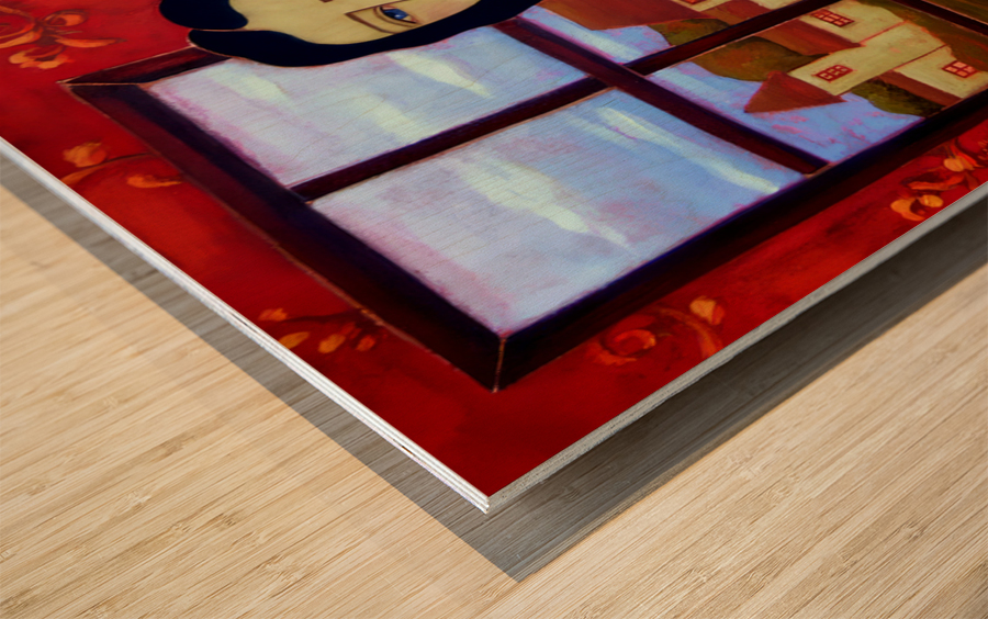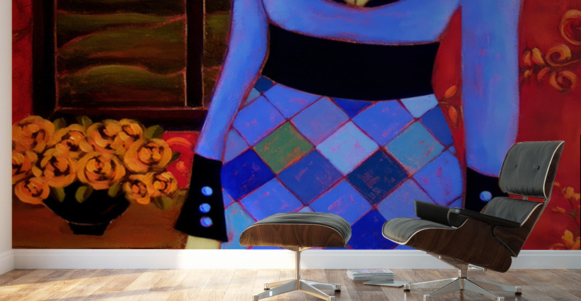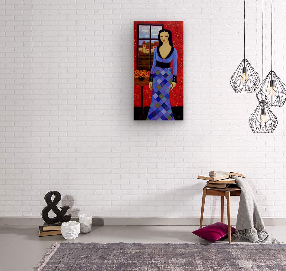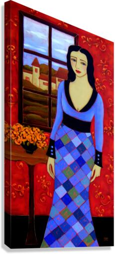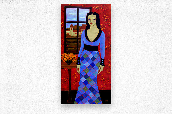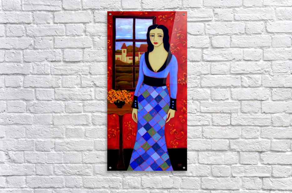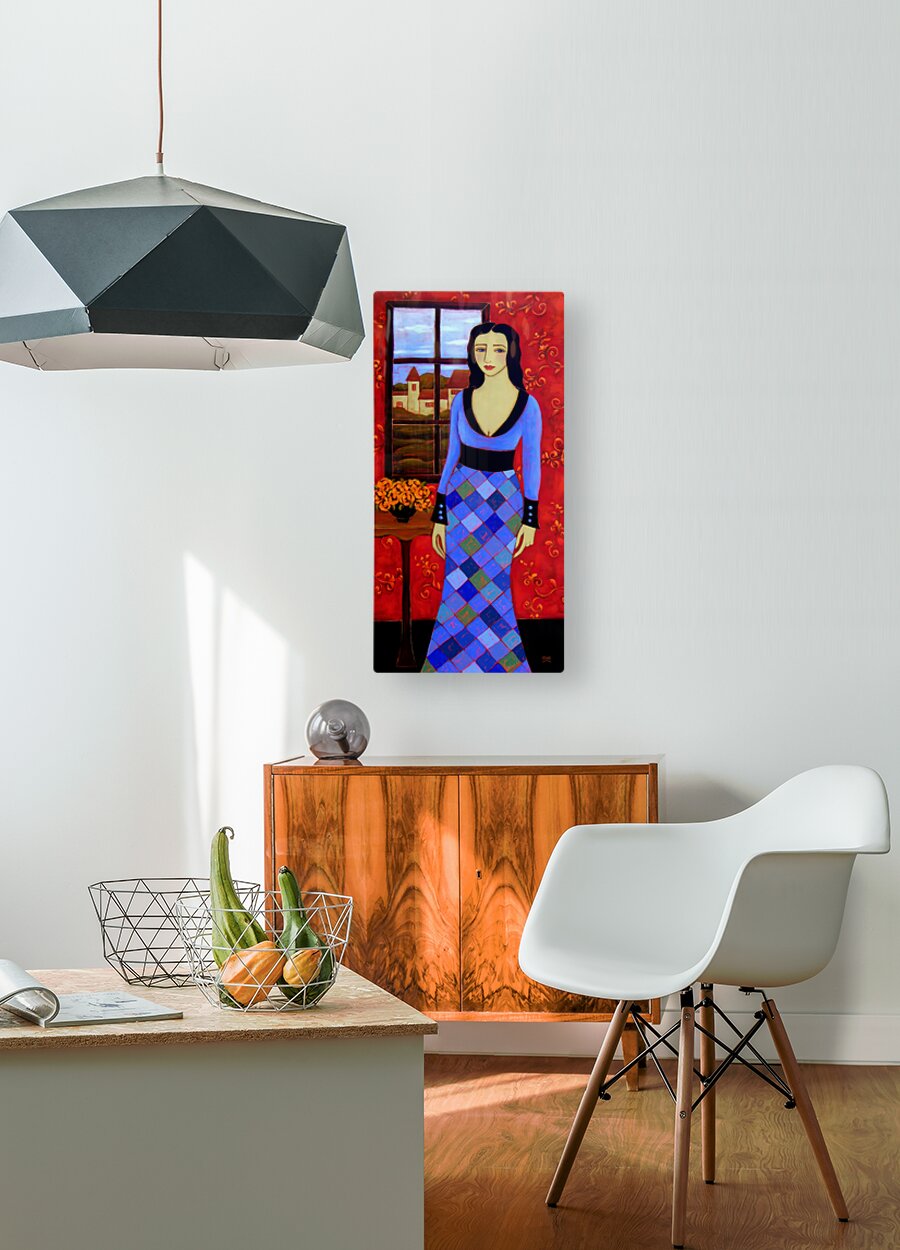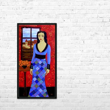 A Long Black Haired Woman with Azure Eyes stands before a Window in a Blue Harlequin Patterned Gown. Through the Window lies a Pastoral Scene with a Village's Houses lit with golden light in anticipation of the coming Evening. A Black Vase sits on her right filled with Orange Roses and on the Background Wall a Deep Crimson Wallpaper adds warmth to this Twilight Scene.